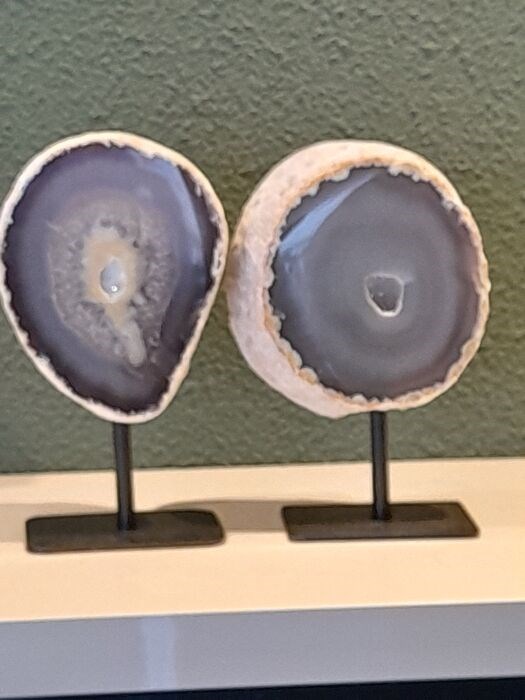 Twee mooie agaat geodes op een metalen standaard.