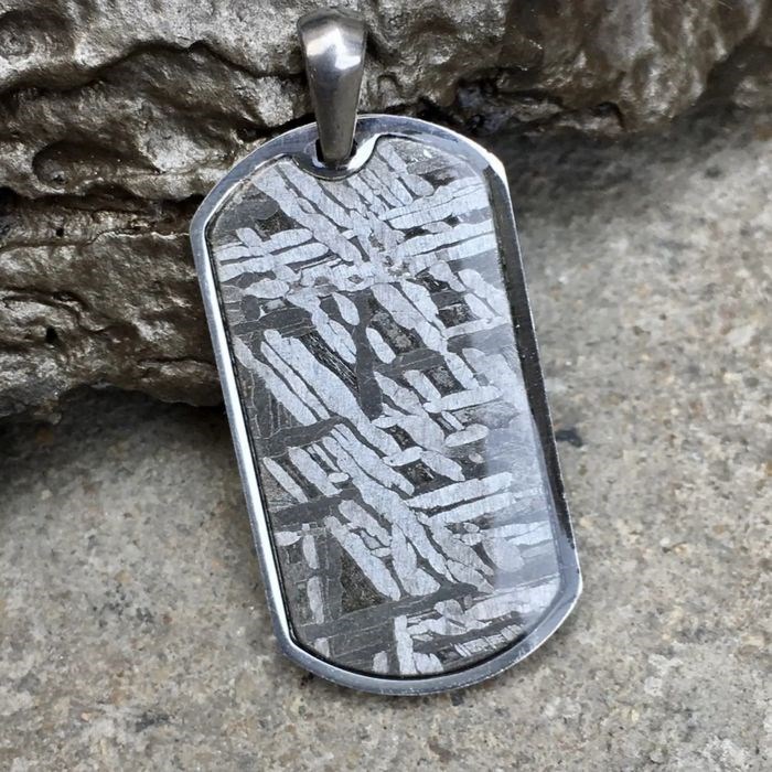 In dit kavel presenteren wij een prachtige hanger gemaakt van Aletai meteoriet (China, 1898) van rechthoekige vorm, gezet in hoogwaardig roestvrij staal, waarin de spectaculaire Widmanstatten lijnen te zien zijn. Behandeld met elektrolyse om oxidatie te voorkomen en bedekt met natuurlijke hars. De foto's zijn indicatief voor het ontwerp, de maat en de afmetingen. U ontvangt een hanger met de beschreven kenmerken, hoewel elk uniek en onherhaalbaar is. We omvatten roestvrijstalen ketting en juwelendoos.