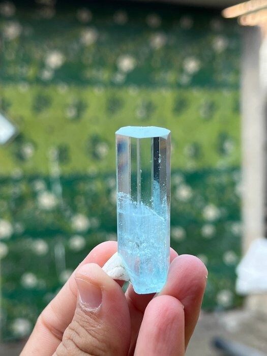 Super gemmy hemelsblauw aquamarijn kristal, het heeft een ongelooflijke glans en grote transparantie met prachtige albite aan de onderkant. Het kristal heeft een kleine beschadiging aan de bovenkant maar de vorm, kleur en glans spreken voor zich.