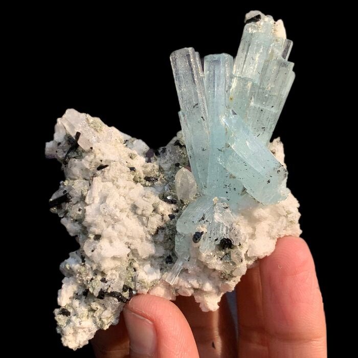 Blauwachtige aquamarijnkristallen Cluster prachtig ingebed in witte sneeuwmatrix met Schorl-kristallen erin. In de bodem van aquamarijnkristallen zijn vooral clusters en over het geheel besneeuwde Albitekwartskristallen te zien. Naar onze bescheiden mening echt een opmerkelijk stuk in dit formaat met ongelooflijke glans en vorm.
