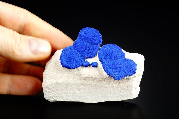 Grote Azurite zonnen op witte contrasterende kaoliniet matrix.