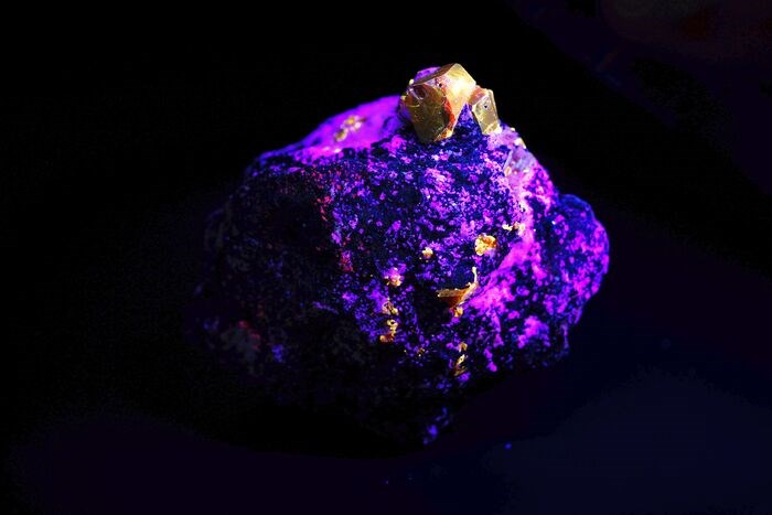 Zirkonen vertonen intensieve gele fluorescentie in UV-licht (SW). Moeilijk om dat grote exemplaar te krijgen.