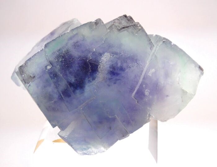 Indigoblauw fluoriet met ongebruikelijke 'sectorzonering' die fragmentarische omhulsels van donkerblauwe kleur vormt en een buitenste cyaan blauwgroene streep. Het oppervlak van de kubussen vertoont een gebogen en geschubde textuur dankzij talloze kleine tetrahexaëdervlakken.