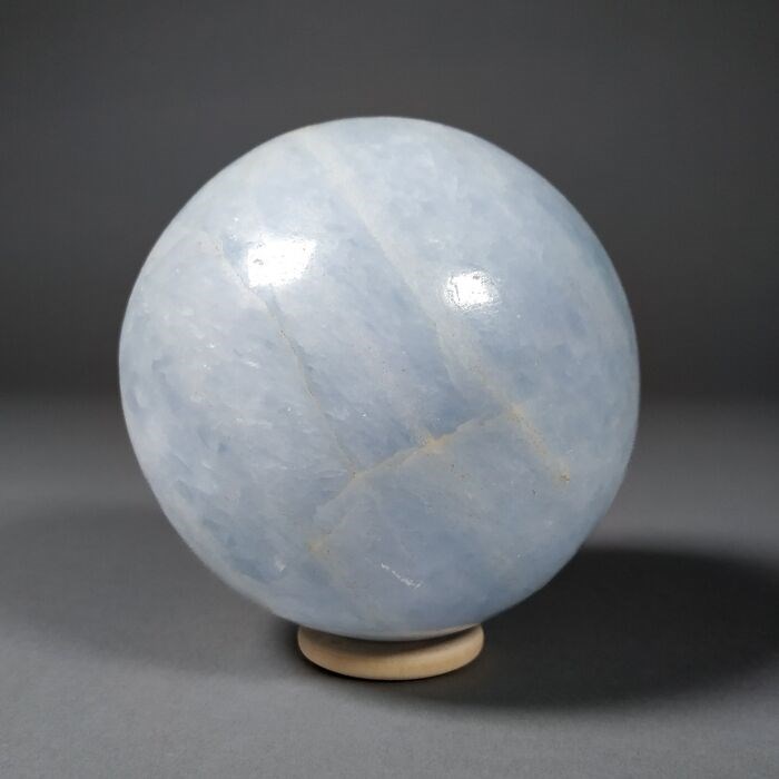 Prachtige blauwe calciet bol uit Madagaskar. Het kavel is inclusief de houten ring.