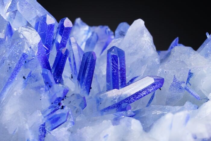 Grote blauwe kwartscluster. Mooie afsluiting, scherpe kristallen. Geverfde kunstmatige kleur.
