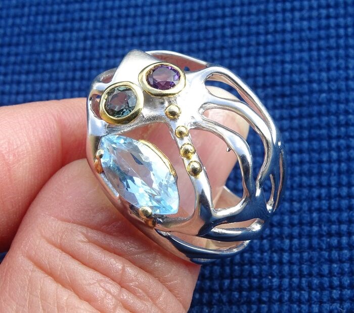 Exclusieve en originele 925 zilveren ring met 3 facetstenen.