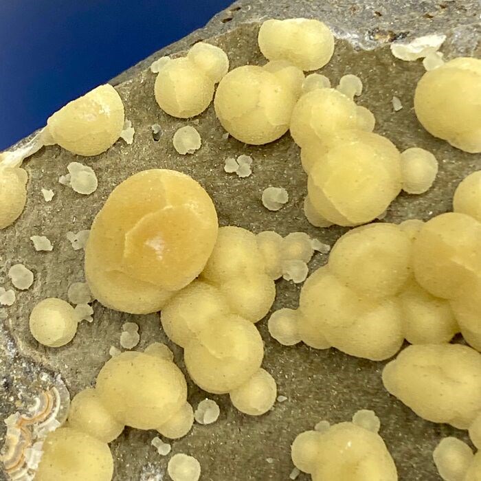 een zeer interessant exemplaar met bijzondere en exclusieve kristallisaties, met een uitzonderlijk esthetisch effect door het contrast tussen de oranjegele bolvormige calciet en de zwarte basaltmatrix