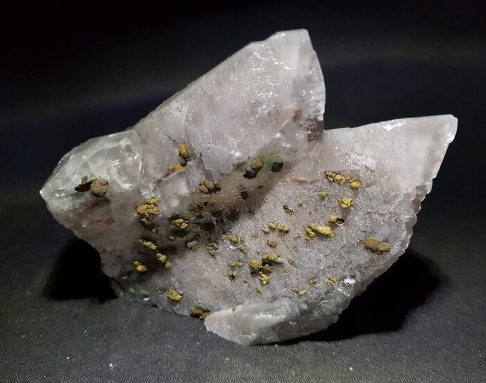 Schitterende grote glanzende doorschijnende calciet met bruine en witte fantomen in het hart, met kleine bolletjes chalcopyriet (sommige insluitsels ook).
