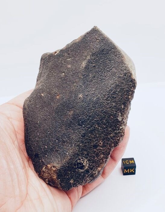 Door ons gekocht in september 2022 bij Youssef D verkoper in Ouarzazate. Zeer mooie meteoriet van aanzienlijk gewicht. Het heeft een zeer mooie patina van de woestijn, op de helft zien we een smeltende korst van zwarte kleur met een mat uiterlijk dat ook microbreuklijnen presenteert die zijn opgetreden tijdens de penetratie in onze atmosfeer.