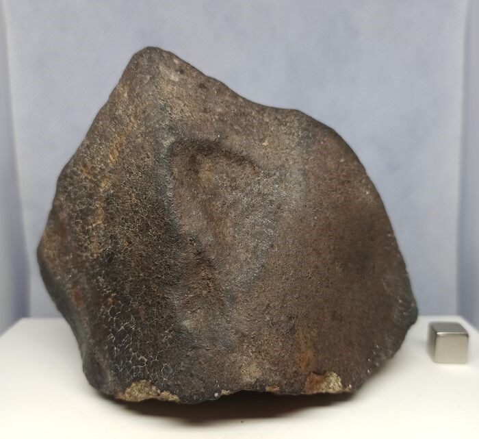 De meteoriet in dit kavel is een mooi compleet stuk chondriet (rotsachtige meteoriet) gevonden in de Sahara-woestijn, met recente smeltkorst, regmaglyphs, mooie vorm en fantastische samentrekkingsscheuren in verschillende gebieden, dat wil zeggen, gebarsten smeltkorst die het ons vertelt plotselinge verandering in temperatuur sinds het de aarde binnenkwam via de atmosfeer en de aardse temperatuur (koud) toen het de grond bereikte. Het heeft een groot formaat en een zeer goede kwaliteit voor een grote collectie of museum.