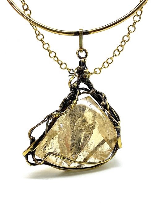 Exclusieve vintage handgeslepen messing ketting en hanger met de enorme Citrien edelsteen.