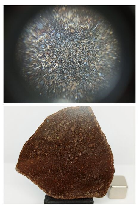 Hoewel ze er met het blote oog gewoon uitzien, kunnen we, als we ze vergroten met een vergrootglas of een soort lens, duizenden kleine chondrulen zien, kenmerkend voor dit type koolstofhoudende chondrieten. Elk van deze bolvormige chondrulen vertegenwoordigt een kleine korrel materie die de grote wolk van gas en stof vormde waardoor het zonnestelsel werd gevormd zoals we dat nu kennen.