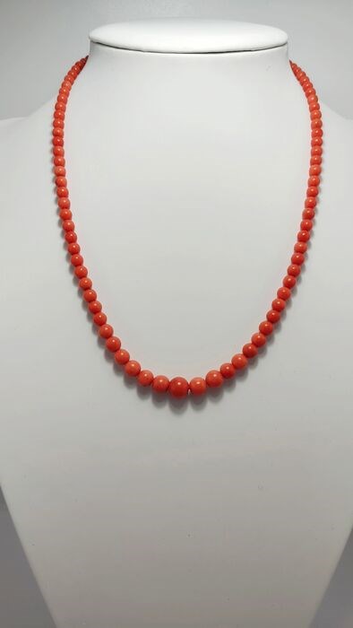 Spectaculaire ketting met gegradueerde Sciacca-koraalbollen gevist aan het begin van de jaren 1800. De bollen werden rond 1950 gesneden en bewerkt door Siciliaanse meesters.