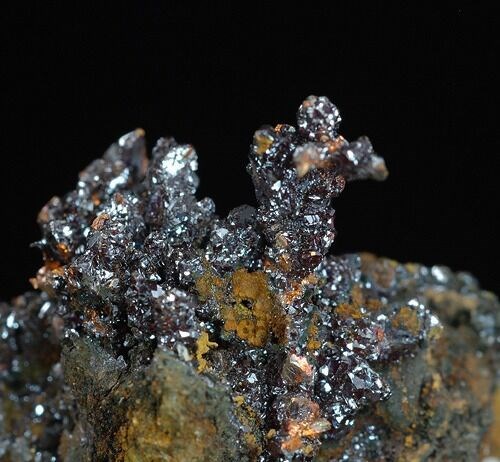 Excellent miniature, where the numerous, brilliant, reddish cuprite crystals (max 4 mm.) are scattered on the copper dendrites.
