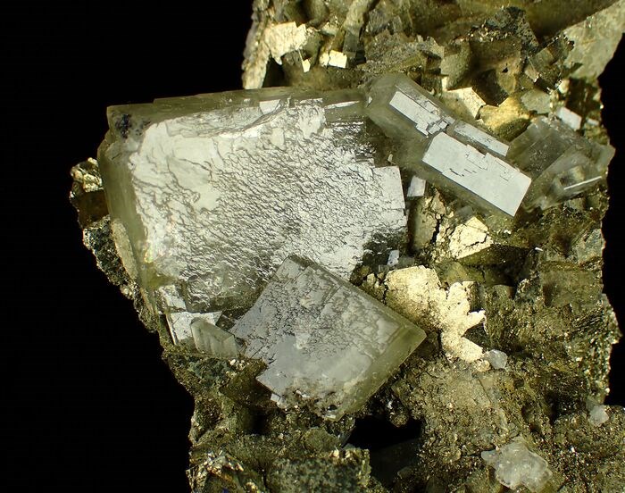 Grote kwaliteit exemplaar van barietkristallen op pyriet. We kunnen hier zeldzame afgietsels van barietkristallen in pyriet zien.