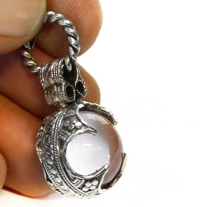 Een prachtige bol van hyalinekwarts gezet in een fijn ingelegde zilveren hanger, versierd met grondige details die het hele juweeloppervlak bedekken.