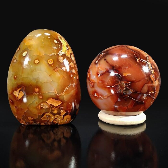 Prachtig paar carneoolerts gepresenteerd in twee verschillende werkingen, een bol en een blok met vrije vorm.