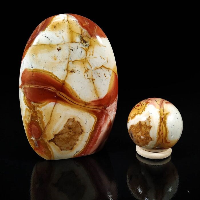 Fantastisch paar polychrome jaspismineralen, een bol en een vrij gevormd blok. We kunnen zien hoe hetzelfde mineraal in verschillende vormen kan worden verwerkt.