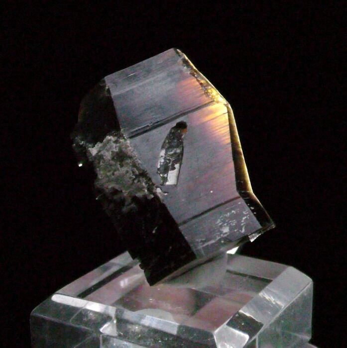 Uitstekend dik en scherp flogopiet kristal, gedeeltelijk doorschijnend en met een prachtige goudgeel-oranje interne kleur, zoals te zien op de eerste foto's bij tegenlicht.