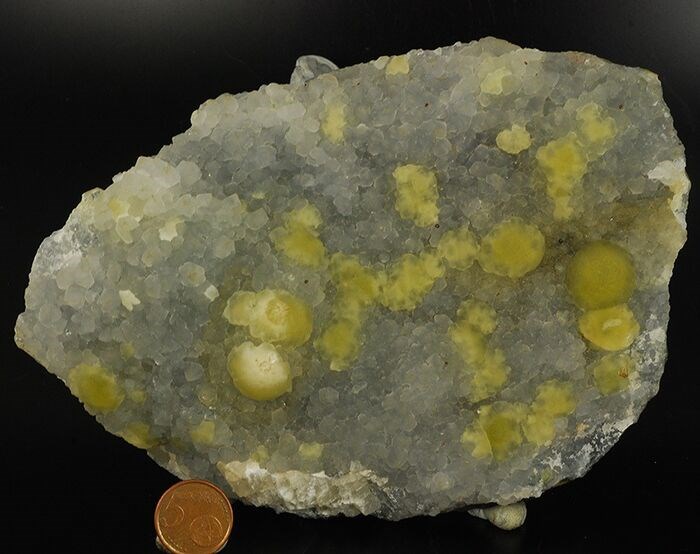 In deze laag zijn talloze groengele halve bollen van fluoriet ingebed.