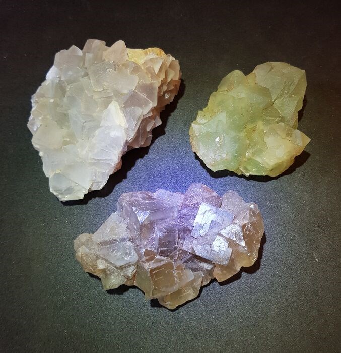 Voor elke fluoriet zijn de eerste foto's 's avonds gemaakt (kunstlicht), de laatste binnen en buiten (enkel natuurlijk licht)