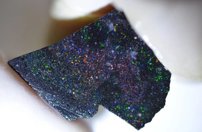 Ik bied je een prachtige ruwe vuuropaal uit Honduras aan die alle kleuren van de regenboog heeft.