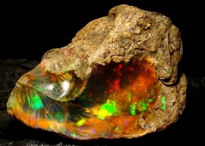 Ik bied je een prachtig onbewerkt Fire Opal Crystal uit Ethiopië aan met blauwe / paarse, groene, rode, gele reflecties.