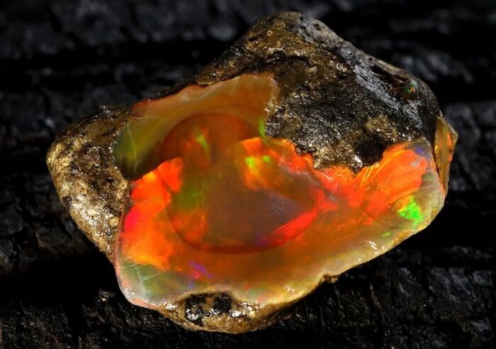 Ik bied je een prachtig onbewerkt vuuropaalkristal uit Ethiopië aan dat alle kleuren van de regenboog heeft.
