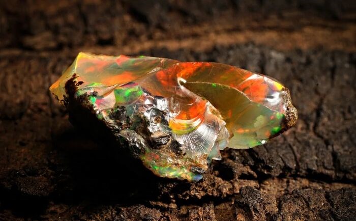 Ik bied je een prachtig onbewerkt vuuropaalkristal uit Ethiopië aan dat alle kleuren van de regenboog heeft.