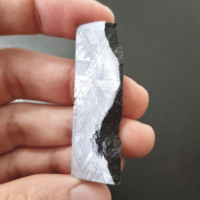 In deze veiling wordt een stuk aangeboden. Het is zeer esthetisch en toont het klassieke Widmanstatten-patroon, de vorm van kristallisatie van ijzer in de ruimte bij een afkoeling van 1 graad Celsius per miljoen jaar. Het patroon is zeer fijn en reflecteert licht in verschillende richtingen.