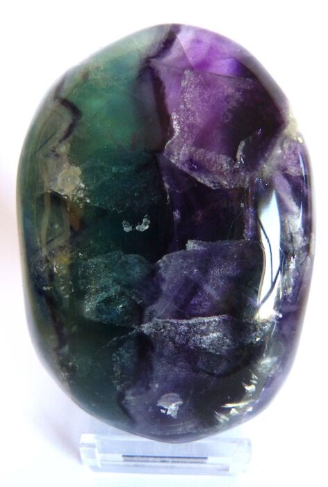 De violette en groene glinsteringen van de fluoriet brengen een diepe kalmte en sereniteit.