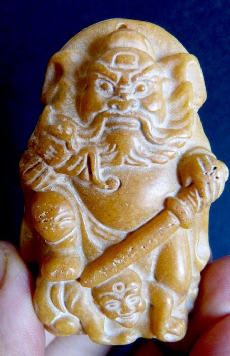 Serpentine Guan Gong hanger, handmatig snijwerk gedaan door Chinese ambachtslieden. Bescherming en geluk amulet.