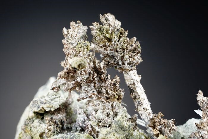 Het Allargentum lijkt vergroeid met zilver en dyscrasiet. Het is duidelijk gedifferentieerd en dominant in de analyse van het monster, dus het juiste label is Allargentum. Het Allargentum vormt boomachtige gezwellen op een calcietrijke matrix