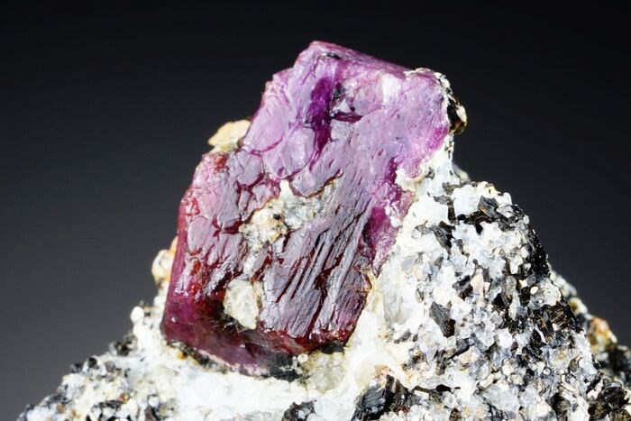 Top korund var saffier en robijn in matrix. Goed gevormd kristal met platenkeppers. Fluorescerend in UV. Kleur is raar - niet blauw/paars en niet rood/robijn maar extra.