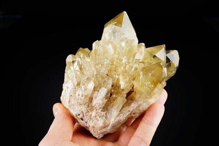 Een heel mooi stuk van dit klassieke materiaal van natuurlijke (onbehandelde) citrien uit Congo. Een paar jaar eerder, toen dit spul op de markt kwam (ongeveer 15 jaar geleden) en het allemaal werd gelabeld als afkomstig uit Zambia om het geheim te houden voor andere gravers. Ik weet niet of er nog meer exemplaren worden gevonden, maar ik weet wel dat er tegenwoordig maar weinig goede exemplaren zijn. Dit stuk heeft een overheersende kristallen die van binnen extreem edelsteen is. Er zijn wat deukjes en markeringen zichtbaar. kleur is donker. foto's zijn gemaakt met sterk kunstlicht.