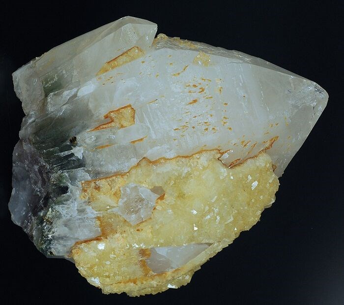 Aan de ene kant zijn andere mini-quarzets gegroeid en gedeeltelijk bedekt met gelige calciet.