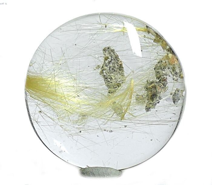 Kwarts van prachtige transparantie met de aanwezigheid van fijne en lange insluitsels van gouden rutielnaalden die harmonieus verdeeld zijn, evenals mooie donkere insluitsels van hematiet. Schitterend schouwspel, zowel met vergrootglas als met het blote oog.