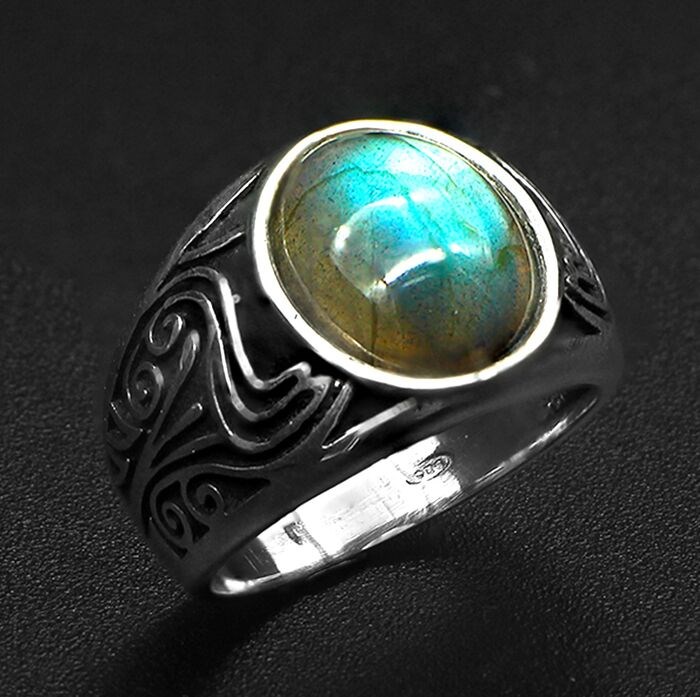 Bijzondere herenring in 925 zilver met centrale steen in Labradoriet van uitstekende kwaliteit met ronde Cabochon-snit en bas-reliëf vakmanschap.