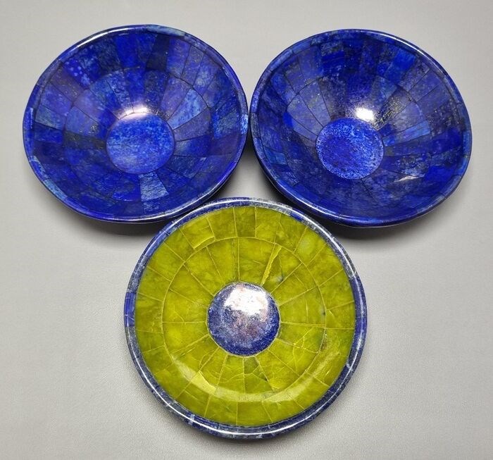 Triplet set handgesneden kommen gemaakt van natuurlijke Lapis Lazuli en Jade serpentijnsteen. Beide kommen zijn volledig functioneel en worden voornamelijk gebruikt voor meditatie en therapie. Zeer goede gelegenheid voor verzamelaars om deze set aan hun verzameling toe te voegen.