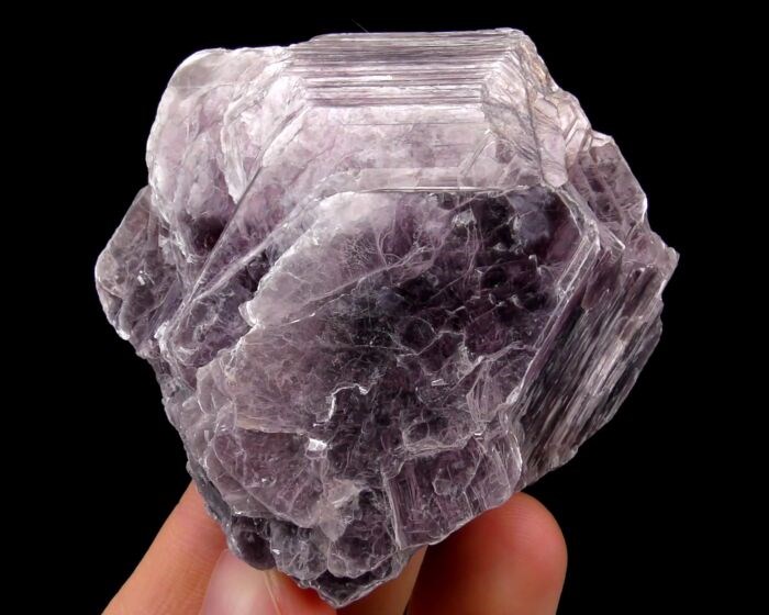 Een enkel groot paars mica-lepidolietkristal, enigszins doorschijnend, met een intense roze interne kleur, zoals te zien op de laatste foto's met tegenlicht.