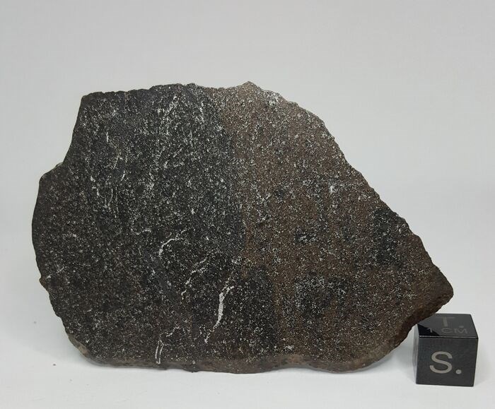 Fysieke eigenschappen: De meteoriet heeft geen fusiekorst en vertoont metaalkorrels die uit het oppervlak steken. Het interieur onthult 2 lithologieën, een bruine en een donkergrijze.