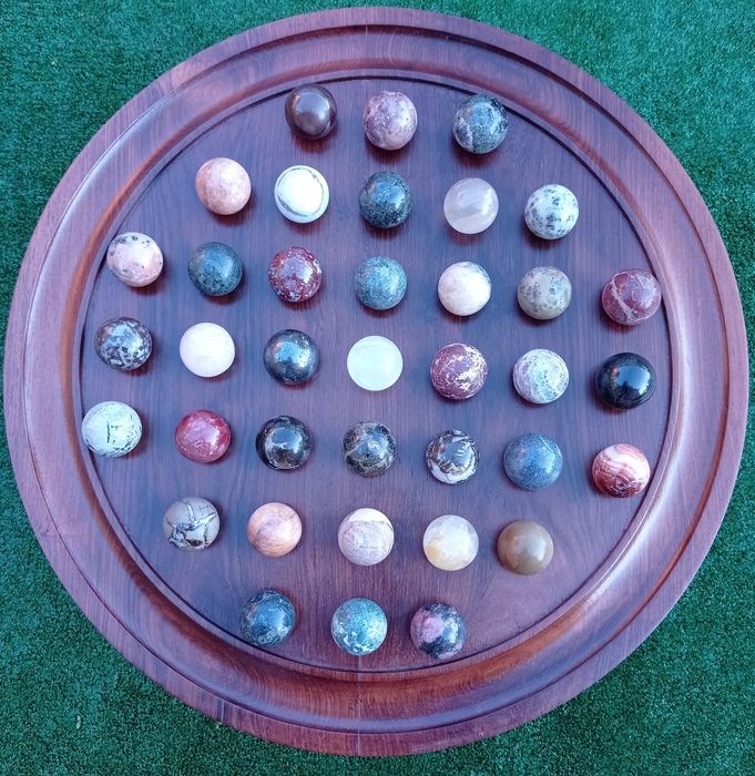 Gepolijste teakhouten solitaire schijf met 36 bollen mineralen uit Madagaskar. De schijf heeft holtes waarin de mineraalbolletjes perfect passen. Ook is er een buitenring gemaakt waar de mineraalbolletjes in passen tijdens het solitaire spel.