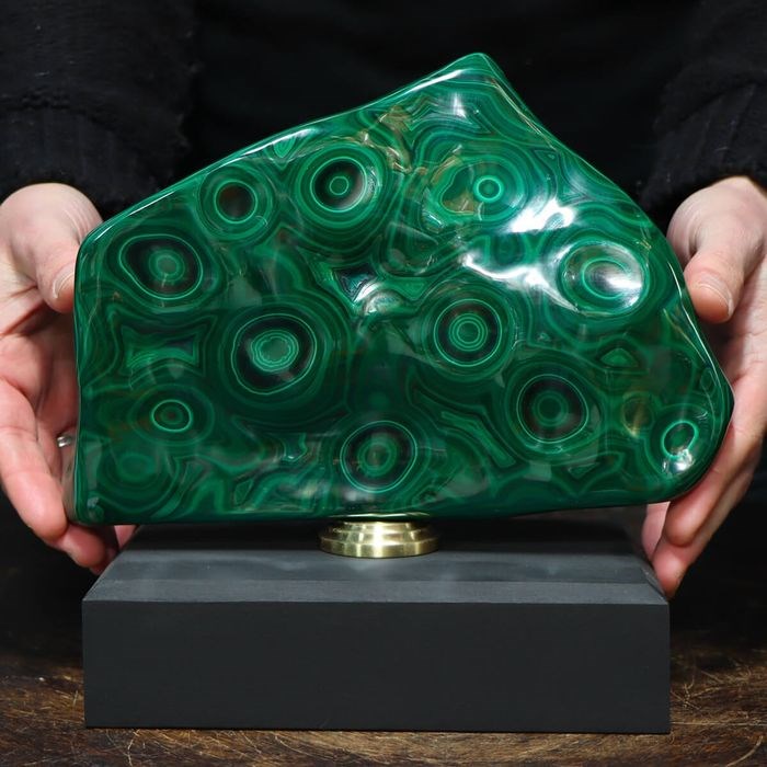 Malachiet van topkwaliteit uit de Democratische Republiek Congo gemonteerd op een gedraaide houten voet om elegant te worden weergegeven in een luxe collectie, of ook als designstuk.