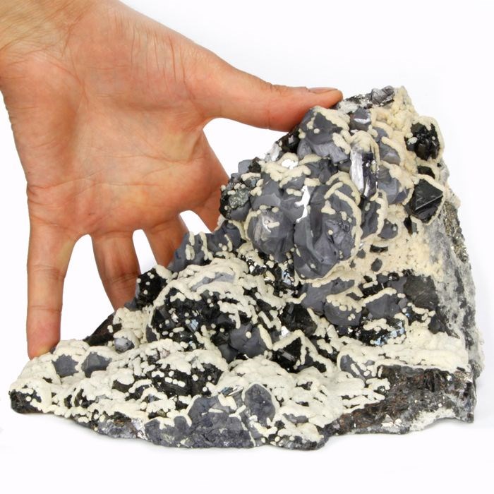 Een prachtige galena uit de mijnen van Madan, de calcietkristallisaties roepen een fantastisch landschap op, een verzameling mineralen met een grote esthetische impact.