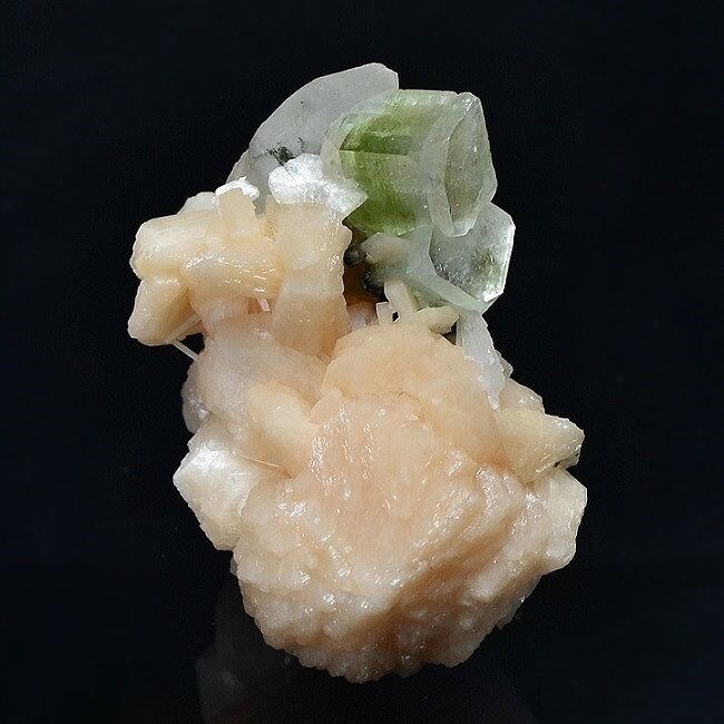 Mooie, zeer esthetische cluster van lichtroze/zalmkleurige silbiet in het gezelschap van groen apofylliet