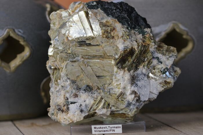 Zonder minimumprijs !!! Heel uitzonderlijk ! Prachtige glanzende muskoviet kristallen met schorl vanuit een uitzonderlijke locatie te Finland !