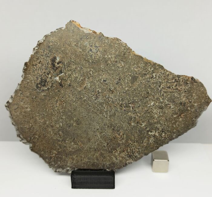 Het exemplaar in deze partij is een grote complete plak EUCRITE gevonden in Libië in 2022, geclassificeerd onder de officiële naam Jikhara 001. Daarin kunnen we de breccia-lithologie van grote schoonheid waarderen, zijnde een herkristalliseerde eucriet. Lithische klasten bestaan uit calciumplagioklaas en aggregaten van fijnkorrelige plagioklaaskristallen.