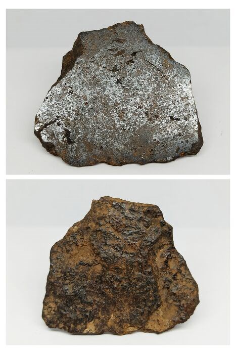 In dit kavel veilen we een mooie, met een gepolijst venster om het interieur te zien, gemaakt van een Mesosideriet-meteoriet, waarin we het materiaal kunnen zien herkristalliseren door het verstrijken van de tijd, wat vooral te zien is op de foto's waarop de gepolijst oppervlak reflecteert het licht. Het is onlangs geclassificeerd onder de naam Mdeïné 001.