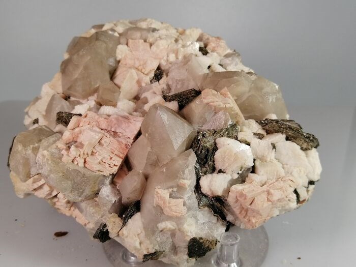 Een prachtige roze orthoklaas plaat in natuurlijk gecorrodeerde kristallen met rookkwarts. Een historisch stuk, zeer moeilijk te vinden in de huidige markt.