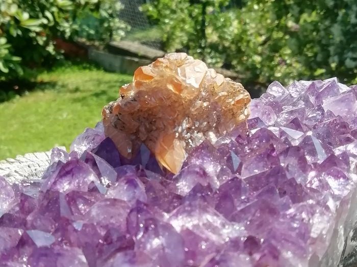 Prachtige amethist druse met prachtige paarse kristallen en oranje calciet kristallen, afkomstig uit Brazilië.